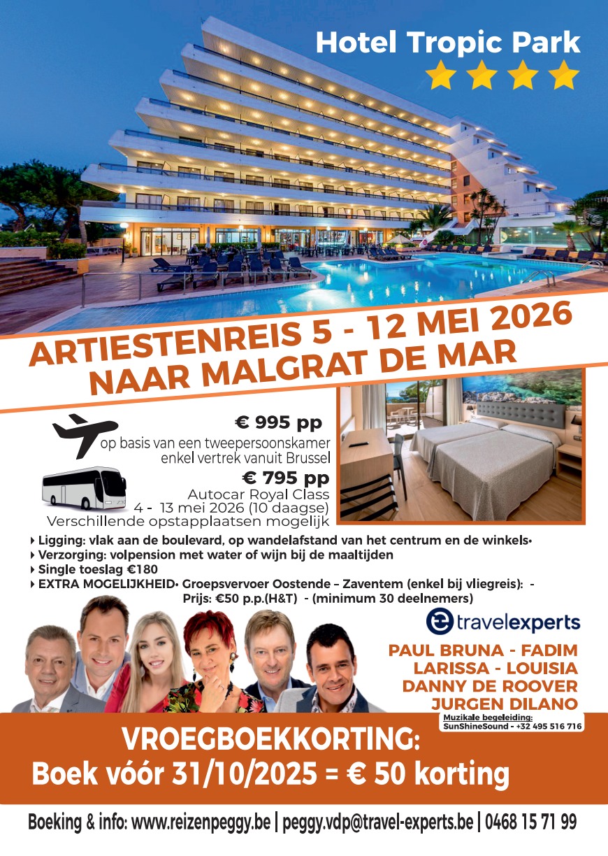 Al meer dan 25 jaar zijn we specialist in fanreizen. Zangers en zangeressen over gans België reizen met hun fans onder volledige begeleiding met ons mee. Luxe autocar of vliegtuig, het kan allemaal. Onze bestemming is Spanje: Lloret de Mar of Benidorm of Salou.